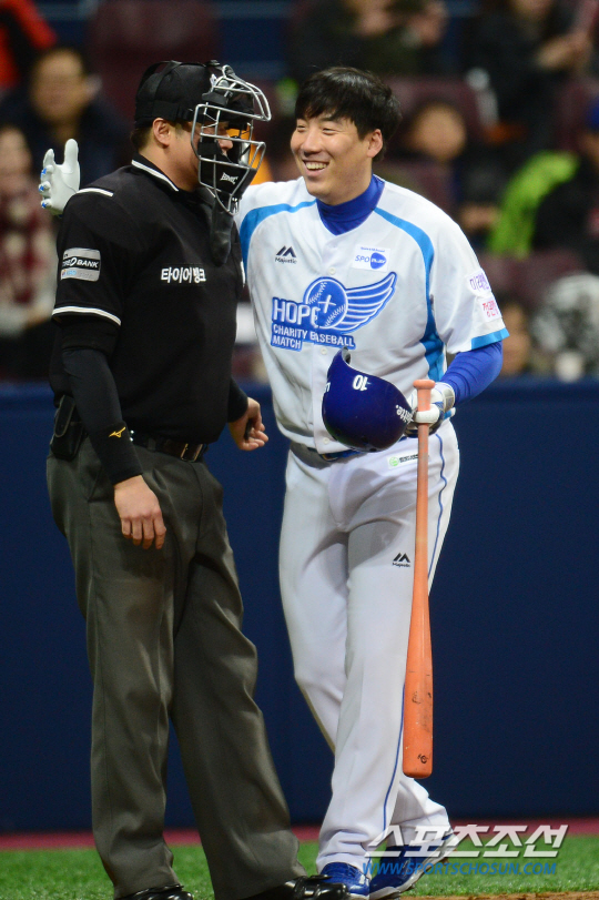 양준혁 야구재단이 개최하는 2015 희망더하기 자선 야구대회가 6일 서울 고척스카이돔에서 열렸다. 4회 대타로 나온 양신팀 김현수가 주심에게 인사를 하고 있다. 고척돔=정재근 기자 cjg@sportschosun.com/2015.12.06/