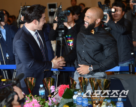 2015 KBO리그 최우수선수(MVP) 및 신인왕 시상식이 24일 서울 양재동 더 케이 호텔에서 열렸다. MVP에 선정된 NC 테임즈가 박병호의 축하를 받고 있다. 양재동=허상욱 기자 wook@sportschosun.com/2015.11.24/ |