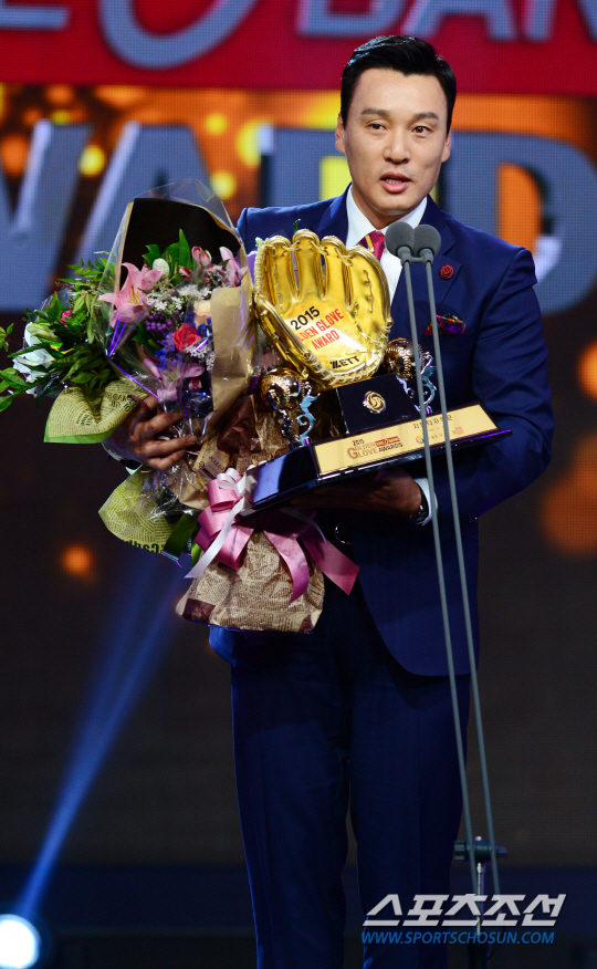 2015 KBO 리그 골든글러브 시상식이 8일 서울 양재동 The-K 호텔 컨벤션센터에서 열렸다. 지명타자 골든글러브를 수상한 삼성 이승엽이 수상소감을 말하고 있다. 정재근 기자 cjg@sportschosun.com/2015.12.08/ |