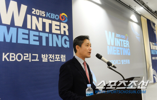 KBO 양해영 사무총장이 9일 서울 양재동 더케이호텔 에서 열린 '2015 KBO리그 발전포럼' 에서 환영사를 하고 있다. 야구관계자들과 팬들이 함께하는 KBO의 이번 윈터미팅은 공개 강연일정과 각 구단 프론트 대상의 비공개 세미나로 채워지는 9일에 이어 10개 구단 프론트의 '분담토론'이 펼쳐질 10일까지 이틀에 걸쳐 열린다. 양재동=최문영 기자 deer@sportschosun.com /2015.12.09/ |