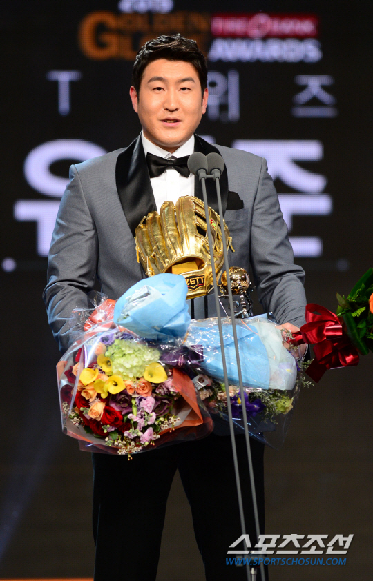 2015 KBO 리그 골든글러브 시상식이 8일 서울 양재동 The-K 호텔 컨벤션센터에서 열렸다. 외야수 골든글러브를 수상한 유한준이 수상소감을 말하고 있다. 정재근 기자 cjg@sportschosun.com/2015.12.08/
