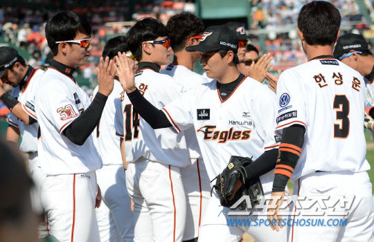 한화와 삼성의 2015 KBO 리그 경기가 29일 대전 한화생명 이글스파크에서 열렸다. 한화 김용주가 4회초 수비를 마친 후 덕아웃으로 향하다 동료들과 하이파이브를 하고 있다. 대전=허상욱 기자 wook@sportschosun.com/2015.09.29/ |