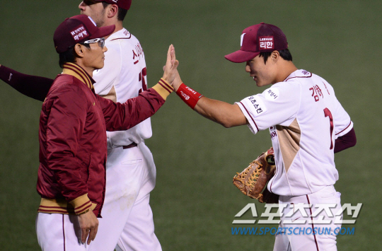 13일 서울 목동야구장에서 2015 프로야구 준플레이오프 3차전 두산과 넥센의 경기가 열렸다. 5대2로 승리한 후 넥센 염경엽 감독이 김하성과 하이파이브를 나누고 있다. 목동=김경민 기자 kyungmin@sportschosun.com / 2015.10.13.