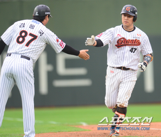 2015 프로야구 두산 베어스와 롯데 자이언츠의 더블헤더 1차전 경기가 24일 부산구장에서 열렸다. 4회말 1사 3루 롯데 강민호가 우중월 투런포를 치고 들어오며 김응국 코치의 축하를 받고 있다. 두산 선발투수로 시즌성적 3승 1패 방어율 4.23의 이현호를 내세웠다. 롯데에서는 13승 9패 방어율 3.39의 린드블럼이 선발 등판했다. 부산=정재근 기자 cjg@sportschosun.com/2015.09.24/ |
