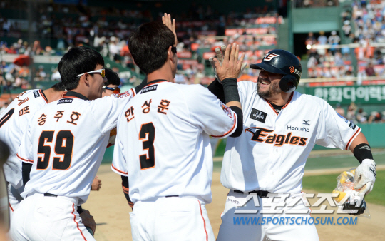 한화와 삼성의 2015 KBO 리그 경기가 29일 대전 한화생명 이글스파크에서 열렸다. 3회말 무사 한화 폭스가 삼성 차우찬의 투구를 받아쳐 좌측 담장을 넘어가는 솔로홈런을 날렸다. 동료들과 기쁨을 나누는 폭스. 대전=허상욱 기자 wook@sportschosun.com/2015.09.29/ |