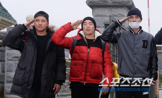 '2015 프리미어12' 에 참가하고 22일 귀국한 삼성 차우찬, 김상수, NC 나성범, 롯데 손아섭, 황재균, 두산 오재원이 23일 충남 세종시에 취치한 32사단 훈련소에 입소했다. 이들은 지난해 인천 아시안게임 금메달 획득으로 군면제 혜택을 받았고 4주간의 기초 군사훈련에 임하게 된다. 세종시=최문영 기자 deer@sportschosun.com /2015.11.23/ |