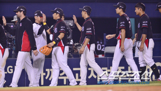 25일 오후 서울 잠실야구장에서 2015 프로야구 KT와 두산의 경기가 열렸다. 10대4로 승리한 후 KT 조범현 감독이 박경수 등 선수들과 하이파이브를 나누고 있다. 잠실=김경민 기자 kyungmin@sportschosun.com / 2015.09.25.