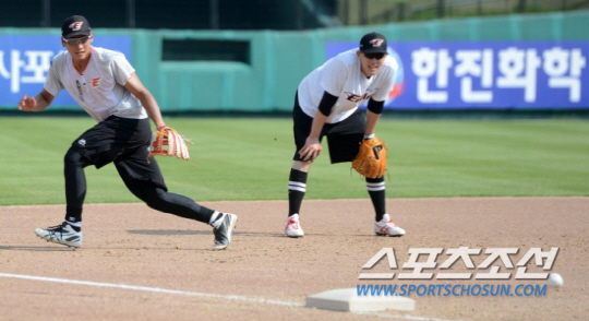 ◇2016시즌에도 한화의 3루수 경쟁이 치열할 전망이다. 올해 3루를 거친 주현상 신성현 김회성에 군제대 선수 오선진과 최윤석이 경쟁하게 된다. 그러나 만약 외국인 3루수가 영입된다면 국내 선수들은 백업이나 멀티 포지션을 맡게될 듯 하다. 사진은 지난 7월31일 대전 KIA전에 앞서 3루 수비 훈련을 하는 신성현과 김회성. 대전=허상욱 기자 wook@sportschosun.com