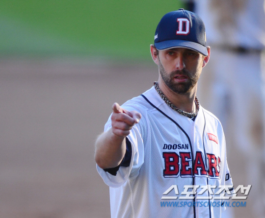 31일 오후 잠실야구장에서 2015 프로야구 한국시리즈 5차전 삼성과 두산의 경기가 열렸다. 7회초 2사 만루서 삼성 나바로를 삼진 처리한 두산 니퍼트가 양의지를 향해 손짓하고 있다. 잠실=김경민 기자 kyungmin@sportschosun.com / 2015.10.31.