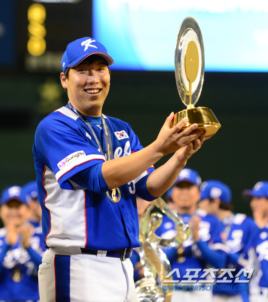 김현수에게 2015년은 모든 걸 다 이룬 해라고 봐도 될 것 같다.21일 오후 일본 도쿄돔에서 프리미어 12 결승전 미국과 한국의 경기가 열렸다. 미국을 꺽고 우승을 차지한 한국의 김현수가 MVP 트로피를 들고 기뻐하고 있다. 도쿄=김경민 기자 kyungmin@sportschosun.com