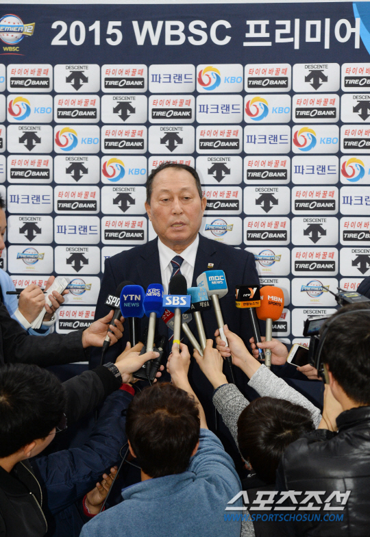 '프리미어 12' 초대 챔피언을 차지한 한국 야구대표팀 22일 오후 김포공항을 통해 귀국하고 있다. 대표팀 김인식 감독이 입국장에서 취재진의 인터뷰에 응하고 있다. 대표팀은 21일 일본 도쿄돔에서 열린 한국과 미국의 '프리미어12' 결승전에서 미국에 8대0 대승을 거두고 우승을 거뒀다. 김포공항=최문영 기자 deer@sportschosun.com /2015.11.22/