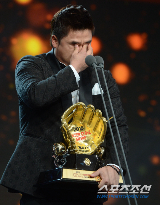 2015 KBO 리그 골든글러브 시상식이 8일 서울 양재동 The-K 호텔 컨벤션센터에서 열렸다. 3루수부문 골든글러브를 수상한 NC 박석민이 소감을 전하다 눈물을 흘리고 있다. 양재동=허상욱 기자 wook@sportschosun.com/2015.12.08/