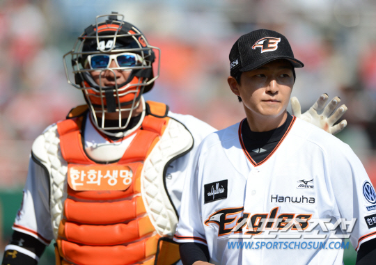 한화와 삼성의 2015 KBO 리그 경기가 29일 대전 한화생명 이글스파크에서 열렸다. 2회초 수비를 무실점으로 마친 한화 김용주가 덕아웃으로 향하며 포수 조인성의 격려를 받고 있다. 대전=허상욱 기자 wook@sportschosun.com/2015.09.29/