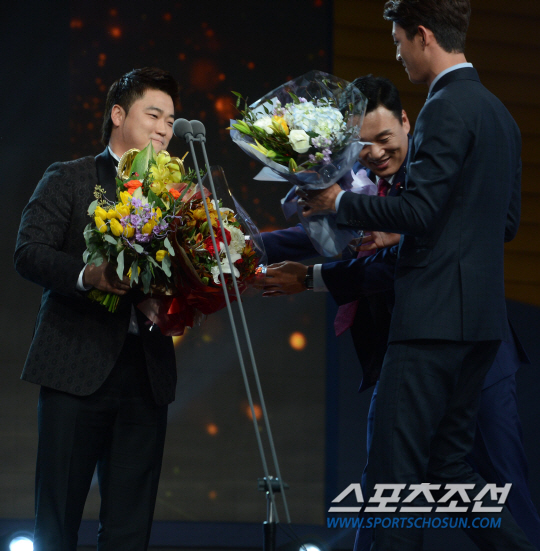 2015 KBO 리그 골든글러브 시상식이 8일 서울 양재동 The-K 호텔 컨벤션센터에서 열렸다. 3루수부문 골든글러브를 수상한 NC 박석민이 삼성 이승엽, 구자욱에게 축하의 꽃다발을 받고 있다. 양재동=허상욱 기자 wook@sportschosun.com/2015.12.08/