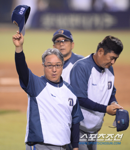 21일 잠실구장에서 KBO리그 플레이오프 3차전 두산과 NC의 경기가 열렸다. NC가 두산에 16대2로 대승을 거두며 시리즈 2승 1패로 앞서게 됐다. 경기 종료 후 팬들에게 인사하고 있는 김경문 감독. 잠실=송정헌 기자 songs@sportschosun.com/2015.10.21
