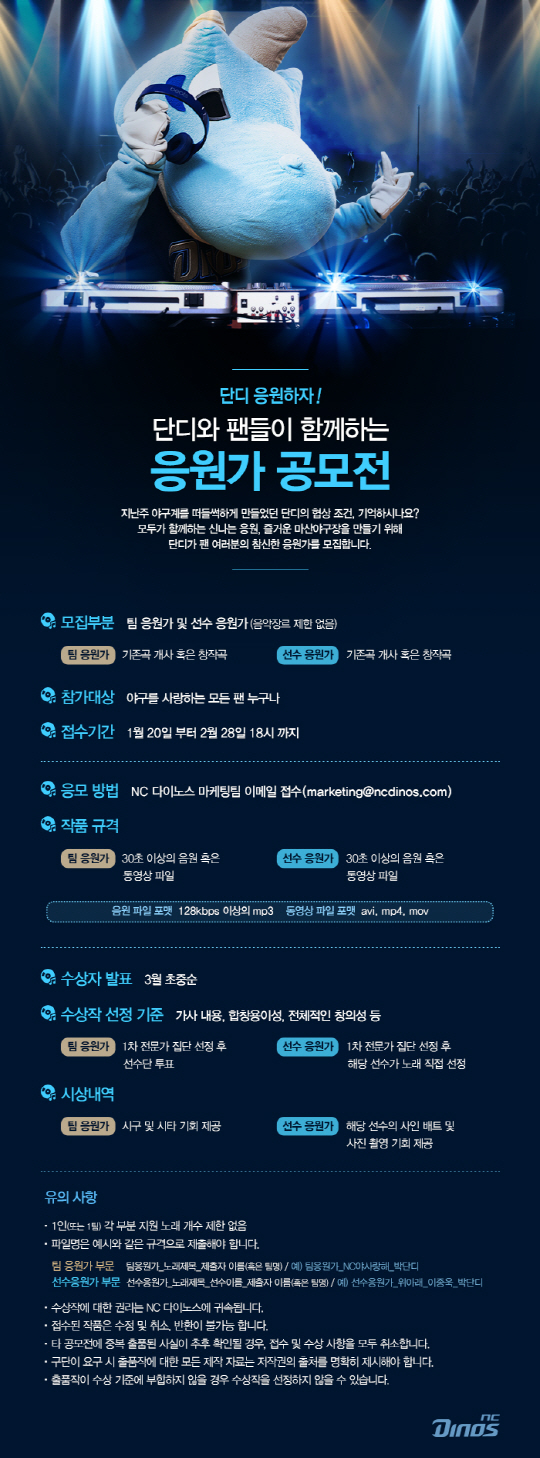 이번 응원가 공모전은 야구를 사랑하는 모든 팬 누구나 참여 가능하며, 2월 28일 오후 6시까지 NC 다이노스 마케팅팀 이메일(marketing@ncdinos.com)로 30초 이상의 음원 또는 동영상 파일을 첨부해 접수하면 된다. 공모전과 관련한 자세한 내용은 NC 다이노스 홈페이지(www.ncdinos.com)를 통해 확인할 수 있다.