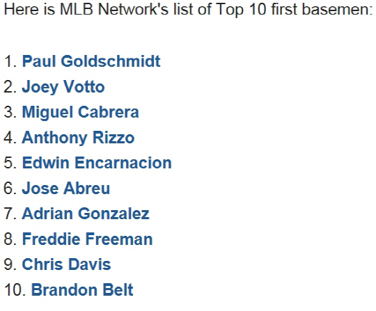 그 다음은 호세 아브레유(시카고 화이트삭스), 애드리안 곤잘레스(LA 다저스), 프레디 프리먼(애틀랜타 브레이브스), 크리스 데이비스(볼티모어 오리올스), 브랜든 벨트(샌프란시스코 자이언