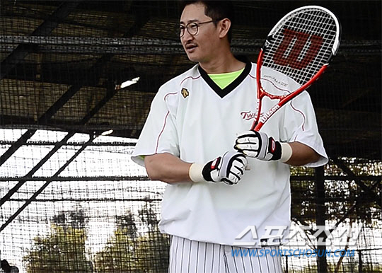 오른손잡이 박용택의 테니스 백핸드 실력은 어떨까? LG 트윈스 선수단이 24일(한국시각) 미국 애리조나주 글렌데일 스프링캠프에서 훈련을 했다. 이날 타자들은 최정우 벤치코치의 지도를 받으며 테니스 라켓을 이용한 타격 훈련을 했다. 최정우 코치는 "직구를 예상하고 배트가 나갔지만 체인지업 같은 공이 들어올 경우 기술적으로 대처하기 위한 훈련법"이라고 설명했다. 우투좌타인 박용택은 오른손으로 테니스라켓을 잡고 훈련을 시작했다. 글렌데일(미국 애리조나주)=정재근 기자 cjg@sportschosun.com