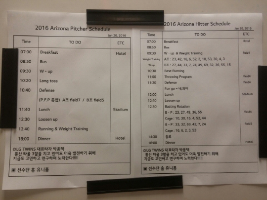 20일 훈련표 주인공은 베테랑 박용택. LG 대표타자 박용택은 '통산 타율 3할을 쳐도 더욱 발전하기 위해 지금도 고민하고 연구하며 노력한다!'고 적혀있다. 이렇게 하루에 1명씩 고참 선수들의 스토리가 선수단에 소개된다.