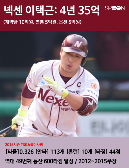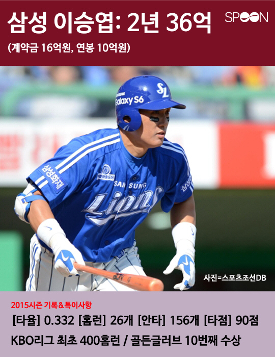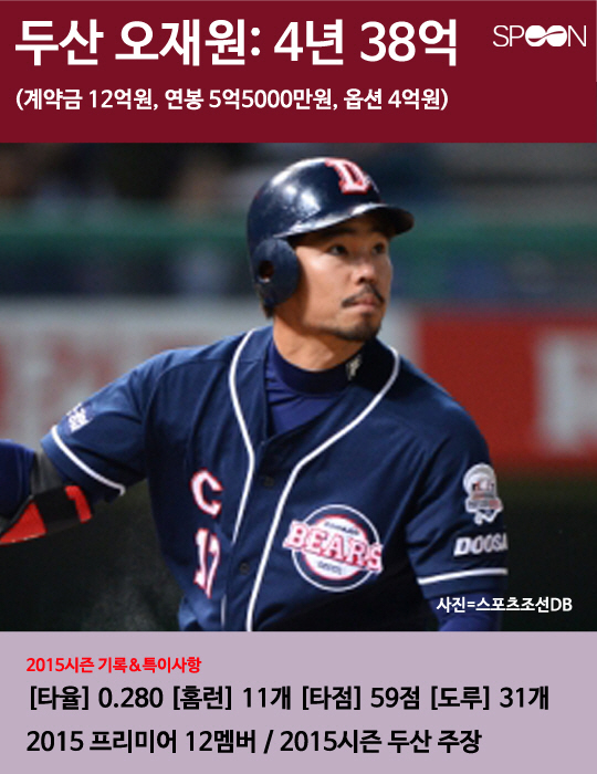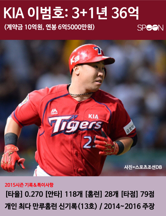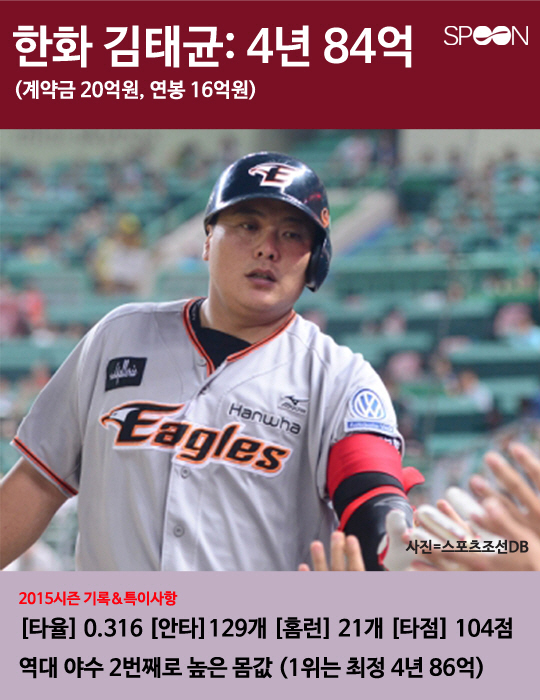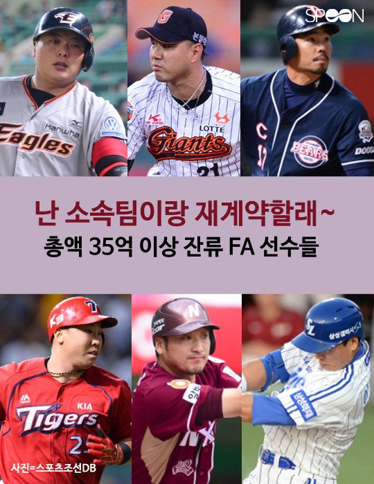2016년 KBO 프로야구 시장에 역대 최다인 22명의 FA(자유계약선수)가 쏟아져 나왔다. 볼티모어 구단으로 메이저리그 진출에 성공한 두산 김현수를 제외한 나머지 21명 중 타 구단 이적을 선택한 선수는 7명이고 원소속팀 잔류를 선택한 선수는 총 14명이다. 14명 중 총액 35억원 이상으로 재계약한 팀 내 간판선수 6명의 2015년도 활약상과 특징을 살펴봤다.