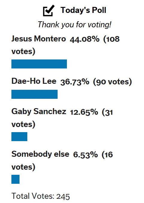 이대호가 4개 보기 중 하나다. 5일 오전 6시 현재 이대호(36.73%, 90표)는 헤수스 몬테로(44.8%, 108표)에 이어 2위를 마크했다. 3위는 개비 산체스(12.65%, 31표), 4위는 기타 선수들(6.53%, 16표)이었다.