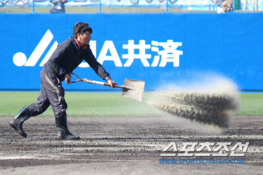 요코하마가 경기를 할 수 있다고 해서 오전에 도착한 기노완구장의 그라운드는 물기가 많았다. 유격수 자리는 여전히 물이 고여있기도 했다. 구장관리 인원 10여명이 부지런히 마른 흙을 실어 나르며 그라운드 정비작업을 계속하는 노력 끝에 경기를 할 수 있는 상태가 만들어졌다.