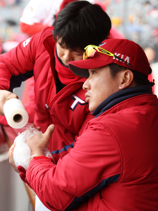 양쪽 덕아웃과 KIA 타이거즈 프런트, 관중석의 팬까지 모두 깜짝 놀랐다. 13일 광주 기아챔피언스필드에서 열린 시범경기 넥센 히어로즈전. 1회말 KIA 김주찬(35)이 첫 타석에서 상대 선발 투수 로버트 코엘로가 던진 공에 왼쪽 손목을 맞았다. 시속 140km 패스트볼에 맞은 김주찬은 극심한 통증을 호소해 대주자 김호령으로 교체됐다. 다행히 엑스레이 촬영 결과 단순타박상으로 나왔다. KIA 구단 관계자는 "손목에 부기가 빠지면 정밀검사를 다시 할 예정이다"고 했다.