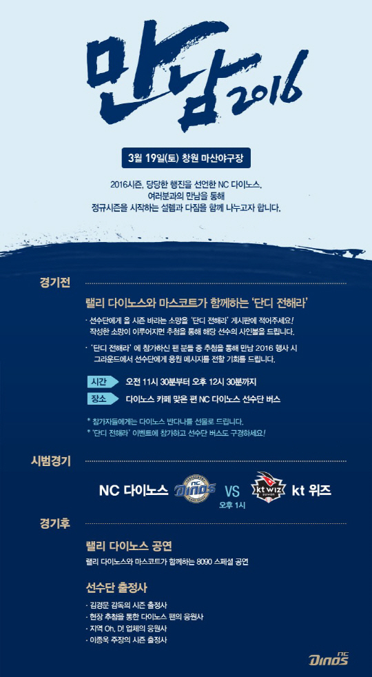 NC 다이노스가 19일 마산구장에서 열리는 kt 위즈와의 홈 경기에서 '만남 2016' 행사를 열고 팬들과 함께 행진을 시작한다.