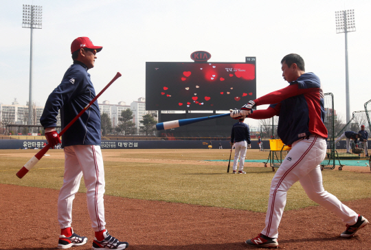 KIA 외야수 김다원이 경기 전 김기태 감독이 지켜보는 가운데 스윙 연습을 하고 있는 모습. 사진제공=KIA 타이거즈