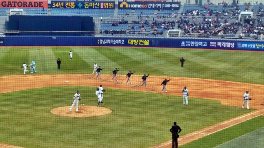 NC의 그라운드 키퍼는 구단의 협력사 직원 6명으로 나이는 40대부터 20대까지 폭넓다. 이중 5명이 야구팬들을 잠시나마 웃게 만들기 위해 음악에 맞춰 율동을 겸하기로 한 것이다.