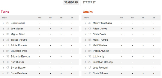미네소타 선발 투수는 우완 어빈 산타나이고, 볼티모어 선발은 우완 크리스 틸만이다.