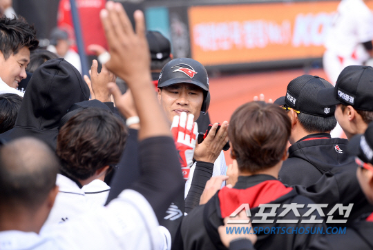 10일 수원 케이티위즈파크에서 KBO리그 kt 위즈와 KIA 타이거즈의 주말 3연전 마지막 경기가 열렸다. KIA와 kt는 시리즈 1승 1패를 기록중이다. kt 김상현이 3회 무사 1루에서 KIA 윤석민을 상대로 중월 투런 홈런을 날렸다. 덕아웃에서 동료들과 하이파이브를 나누고 있는 김상현. 수원=송정헌 기자 songs@sportschosun.com