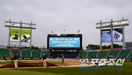 16일 잠실야구장에서 KBO리그 두산 베어스와 삼성 라이온즈의 경기가 열린다. 우천으로 인해 경기 시작이 지연되고 있다. 방수포를 정리하고 있는 그라운드 요원들. 잠실=송정헌 기자 songs@sportschosun.com