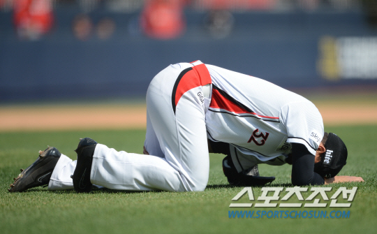 SK 와이번스와 KT 위즈의2015 프로야구 경기가 17일 수원구장에서 열렸다. 5회초 2사 1, 2루 SK 이명기 타석 kt 선발투수 피노가 허벅지에 통증을 호소하며 그라운드에 엎드려 고통스러워하고 있다. 피노는 잠시 후 다시 투구를 재개했다. 수원=정재근 기자 cjg@sportschosun.com
