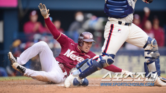 4회초도 그랬다. 1사 1,2루에서 5번 김민성이 친 타구가 2루수 키를 살짝 넘긴 짧은 안타가 됐다. 2루주자 고종욱이 3루를 돌았으나 홈까진 뛰기 쉽지 않은 타구. 그러나 고종욱은 다시 홈으로 뛰었다. 우익수 김원섭의 송구가 옆으로 빠지면서 또 득점 성공.