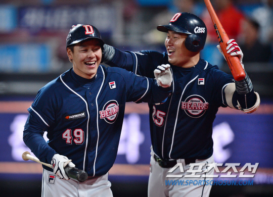 20일 오후 수원 kt위즈파크에서 2016 프로야구 두산과 kt의 경기가 열렸다. 5회초 두산 민병헌이 3점 홈런을 친 후 양의지와 기뻐하고 있다. 수원=김경민 기자 kyungmin@sportschosun.com