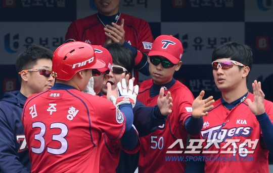 10일 수원 케이티위즈파크에서 KBO리그 kt 위즈와 KIA 타이거즈의 주말 3연전 마지막 경기가 열렸다. KIA와 kt는 시리즈 1승 1패를 기록중이다. KIA 김주형이 4회 kt 피노를 상대로 솔로홈런을 날렸다. 덕아웃에서 동료들과 하이파이브를 나누고 있는 김주형. 수원=송정헌 기자 songs@sportschosun.com