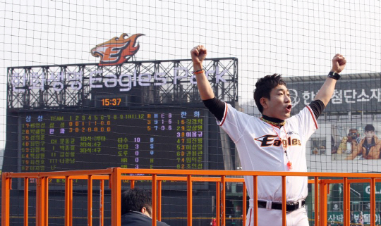 올해 가장 짜릿했던 순간은 26일 KIA전 2회 김태균의 선제 홈런. 지난 주말 두산 베어스와의 주말 경기 때부터 김태균 타석 때 홈런을 외쳤다. 그런데 두산 3연전에서 12타수 무안타. 26일 2회 첫 타석 때도 "김태균 홈런"을 외쳤는데, 거짓말처럼 시즌 첫 홈런이 나왔다. 4대2 승리로 이어진 한방이었다. 선수가 힘을 내면 팬도 응원단장도 신이 난다.