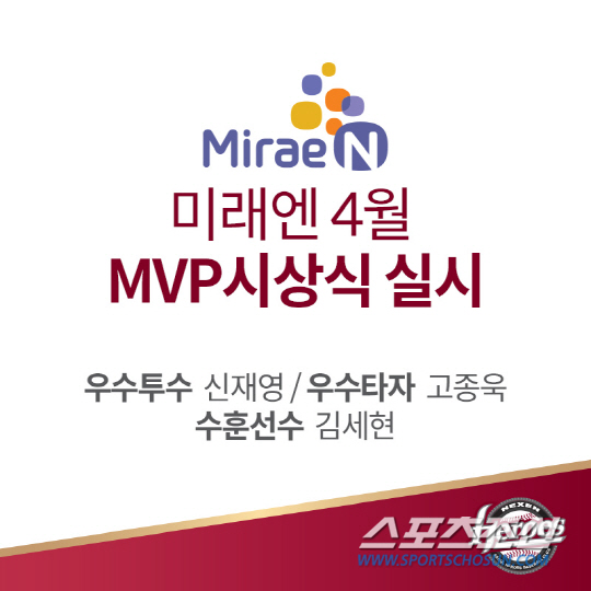 이번 미래엔 4월 MVP중 우수투수와 우수타자에 선정 된 신재영, 고종욱에게는 각각 200만원, 수훈선수에 선정 된 김세현에게는 100만원의 상금을 수여한다.