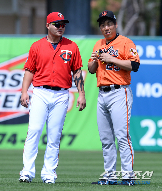 메이저리그 미네소타 트윈스와 볼티모어 오리올스의 시범경기가 6일 (한국시간) 플로리다주 포트마이어스의 해먼드 스타디움에서 열렸다 경기전 미네소타 박병호와 볼티모어 김현수가 만나 반갑게 인사를 나누고 있다.. 플로리다(포트마이어스)=최문영 기자 deer@sportschosun.com