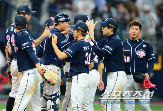 13일 서울 고척스카이돔에서 KBO리그 넥센 히어로즈와 두산 베어스의 경기가 열렸다. 두산이 넥센을 상대로 8대4로 승리했다. 경기 종료 후 하이파이브를 나누고 있는 두산 선수들. 송정헌 기자 songs@sportschosun.com/2016.05.13
