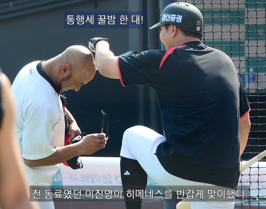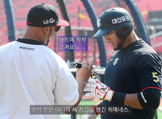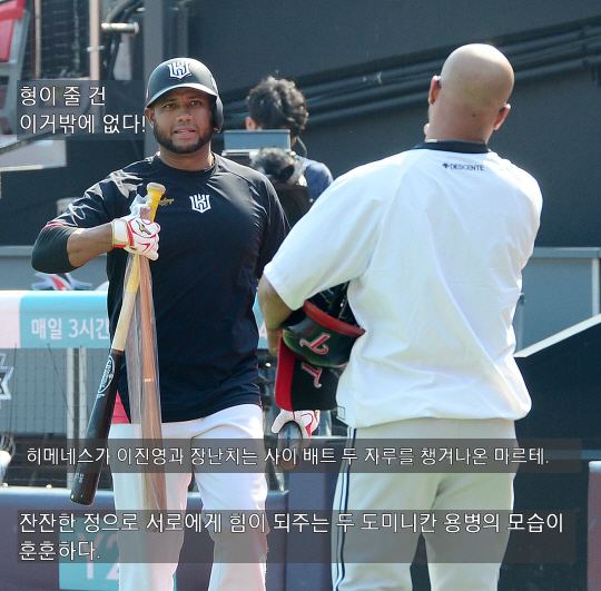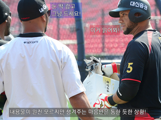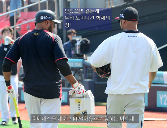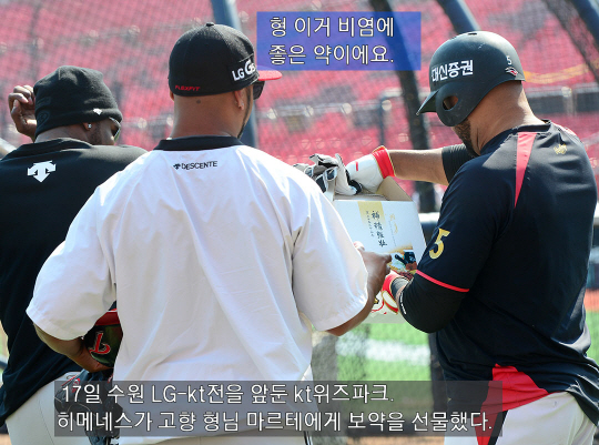 프로야구 LG와 KT의 경기가 열리는 17일 수원 KT위즈파크. 경기 전 LG 히메네스와 KT 마르테가 그라운드에 만났다. 마르테와 소사, 히메네스 모두 도미니카 공화국 출신 용병. 마르테가 큰 형이고 두 살 아래가 소사, 막내 히메네스가 5살 아래다. 경기장에서 만나기만 하면 서로 선물을 주고받는 히메네스와 마르테가 이날은 좀 더 훈훈한 풍경을 만들었다. 알레르기성 비염으로 고생한 마르테를 위해 히메네스가 자양강장 보약을 선물한 것. 실력 좋은 두 용병의 마음씨도 참 따뜻하다. 수원=정재근 기자 CJG@SPORTSCHOSUN.COM