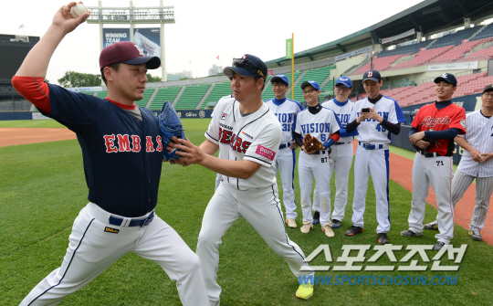 기다리던 투구 시간이 왔다. 하나 둘씩 어깨를 빙빙 돌리며 '보여주겠다'는 의지를 불태웠다. 기본 중의 기본인 캐치볼. 회원들은 눈앞에서 공을 주고 받다가 점차 거리를 늘려갔다. 이현승도 이들과 함께 공을 주고 받았다. "혹시 몇 년 차세요? 진짜 잘 던지시네요. 우리 팀에 자리 있나 한 번 알아봐 드릴까요?" 이현승이 농담을 던지면서 분위기를 이끌었다. 이후 몇 분이 흘렀을까. 이현승이 회원들을 한 데 모았다. 몇 가지 부족한 점을 포착하고 이에 대한 설명을 이어갔다. "캐치볼이 정말, 아주 정말 중요합니다. 상대가 잡을 수 있게 타깃을 정해서 던져야 합니다. 벨트 위에서 얼굴 사이로 정확히 뿌려야 합니다. 그 다음 단계가 세게 던지는 겁니다. 다들 마운드에서 어떻게 잘 던질까를 생각하시는데, 그보다 캐치볼에 많은 시간을 할애하세요. 그래야 좋은 투수가 됩니