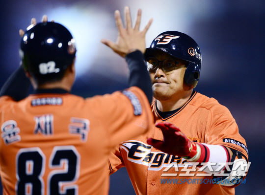 kt 위즈와 한화 이글스의 2016 프로야구 경기가 21일 대전구장에서 열렸다. 11회말 2사 1, 3루 한화 조인성이 8-8 동점을 만드는 1타점 안타를 친 후 축하를 받고 있다. 대전=정재근 기자 cjg@sportschosun.com