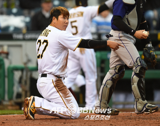 피츠버그는 이날 경기에선 진한 아쉬움을 남겼다. 강정호는 2루타를 때린뒤 1사 3루에서 내야땅볼때 홈을 파고들었으나 포수 블로킹에 막혀 아웃당했다. 먼저 홈플레이트에 도달했으나 포수의 무릎 블로킹에 막혔다. 판정 챌린지(비디오 판독)를 신청했으나 번복되지 않았다. 강정호는 5회말 2사 1루에서는 중견수 플라이로 물러났다. 이날의 마지막 타석. 강정호는 6회초 수비때 교체됐다. 슬라이딩을 하면서 왼손이 포수 무릎 가드에 부딪혀 꺾였는데 통증을 느꼈다. AP통신은 "강정호는 5회 공격을 마친 뒤 왼손목에 불편함을 느꼈다"고 전했다.