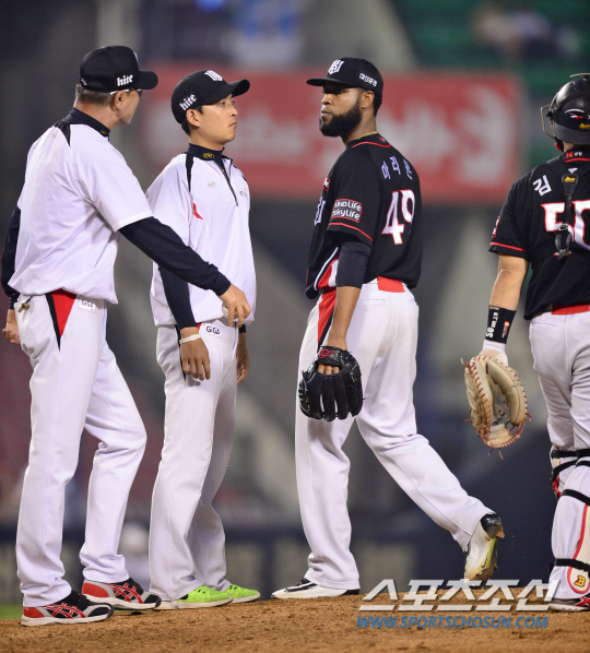 하지만 이런 식의 제구력 난조 현상이 똑같이 나타났음에도 마리몬이 무너진데 반해 장원준은 6회까지 2실점으로 버텼다. 포수의 역량에서 비롯된 차이다. kt 선발 포수인 김종민은 이날 거의 모든 볼배합을 벤치로부터 지시받았다. 스스로 창의적인 볼배합을 구성해 투수를 리드하지 못했다. 아직 성장 과정에 있는 김종민의 어쩔 수 없는 한계다. 그를 탓할 수만은 없다. 주전포수 장성우가 불미스러운 사건으로 징계 중인 kt의 구조적 문제다. 그러나 이렇게 제 3자인 벤치로부터 지시받는 리드는 투수의 신뢰를 얻기 어렵다.