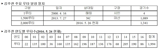 KBO는 김주찬이 2,000루타를 달성할 경우 KBO로부터 기념상을 받는다.