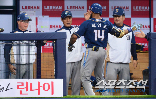 홈런 간격이 줄더니 홈런이 쏟아졌다. 가장 강력한 타자, 무서운 타자로 돌아 온 것이다. 테임즈는 28일 원정 KIA전 7회에 15번째 홈런을 터트리고, 마침내 홈런 1위에 올랐다. KBO리그 311경기 만에 통산 99호 홈런을 때렸다. 역대 최고의 외국인 타자로 꼽히는 타이론 우즈가 2000년 324경기에서 친 100홈런까지 한걸음 남았다.