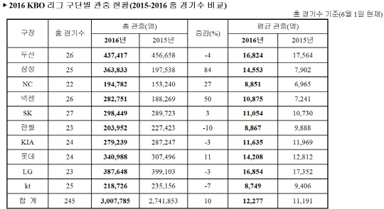 또 올 시즌 100만 관중까지는 26일-91경기, 100만에서 200만 관중까지 22일-77경기가 걸렸지만 300만 관중은 지난 5월 13일 200만 관중 이후 19일-77경기만으로, 3일 가량 기간을 단축했다.