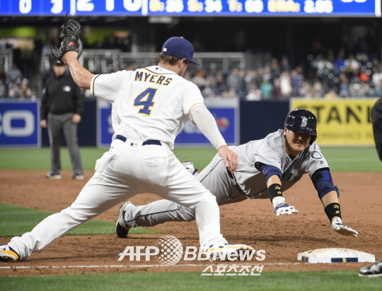 첫 안타를 터뜨린 것은 3-7로 뒤진 3회초. 선두타자로 들어선 이대호는 볼카운트 2B1S에서 프리드리히의 88마일짜리 몸쪽 높은 직구를 잡아당겨 좌측으로 큰 타구를 날렸다. 맞는 순간 홈런을 예상할 수 있을 정도로 배트 중심에 정확히 맞혔지만, 타구는 펜스를 때리고 튀어나왔다. 이때 이대호는 1루를 돌아 2루까지 내달렸다. 그런데 샌디에이고 좌익수 멜빈 업튼 주니어가 튀어나온 공을 바로 잡아 재빨리 송구하는 모습을 본 이대호는 질주를 멈추고 1루로 방향을 다시 틀었다. 하지만 이미 죽은 속도를 되살리기에는 시간이 없었다. 이대호는 전력으로 1루를 향해 달리다 몸을 던져 헤드퍼스트 슬라이딩을 했지만, 상대 수비진의 정확한 중계 플레이에 결국 태그아웃당하고 말았다. 올시즌 첫 2루타가 기대됐으나 결국 단타에 그쳤다.